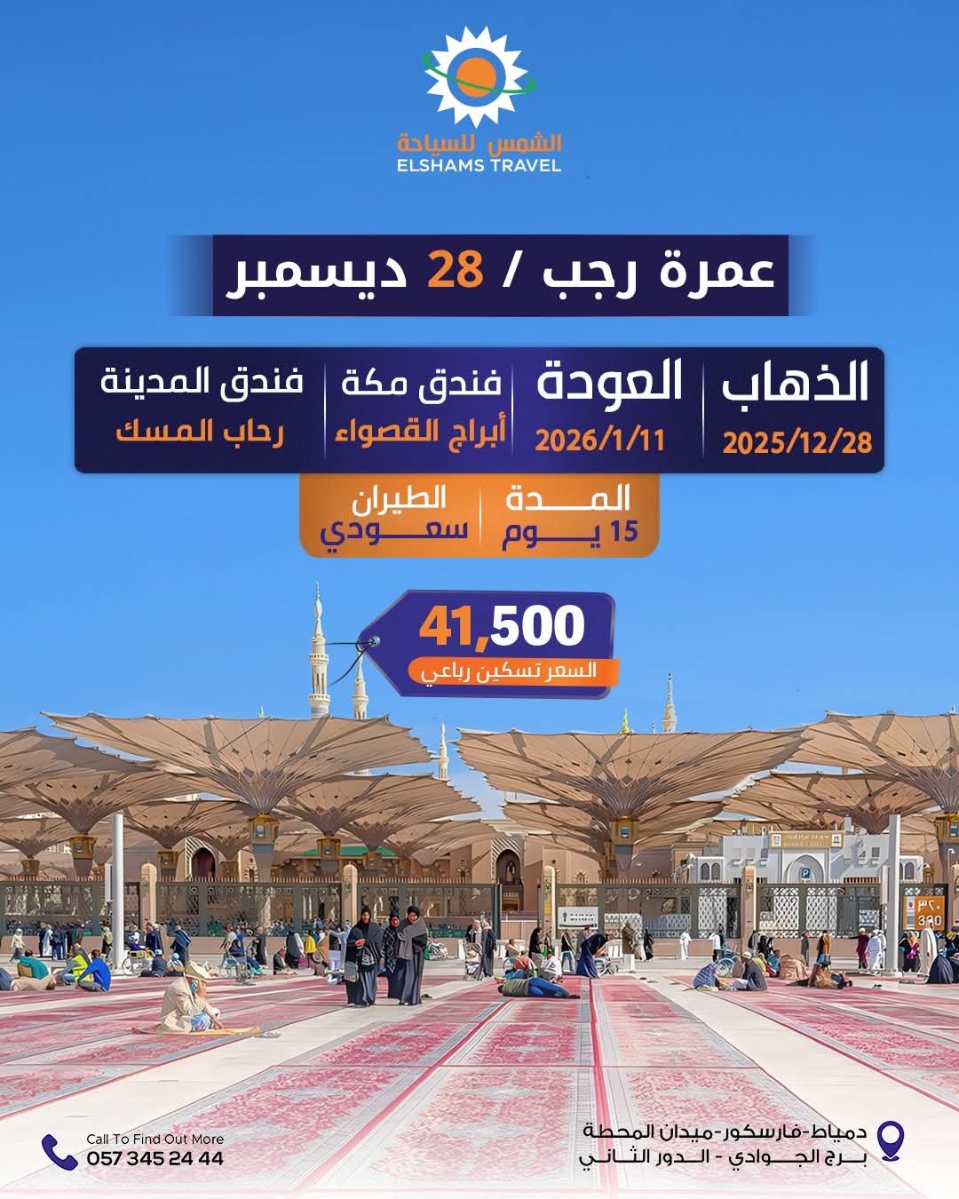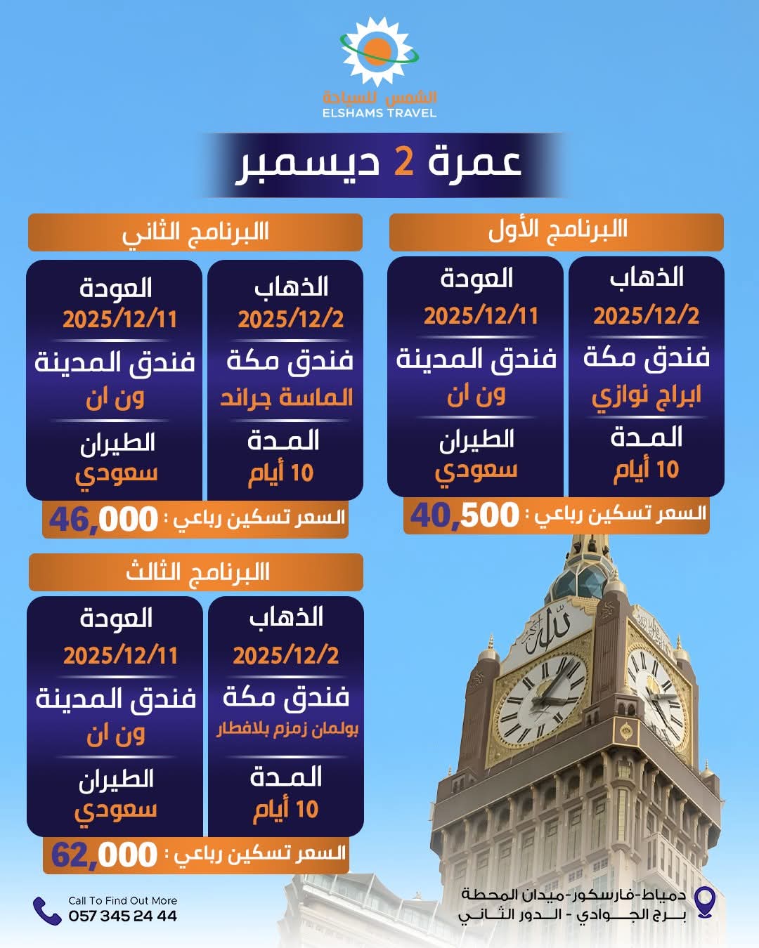 انضموا لرحلة روحانية مميزة تمتد لـ 10 أيام من الراحة والإيمان بين مكة والمدينة 🕋🤍 📅 موعد السفر: 2 ديسمبر 📅 موعد العودة: 11 ديسمبر ⭐ برنامج 3...
